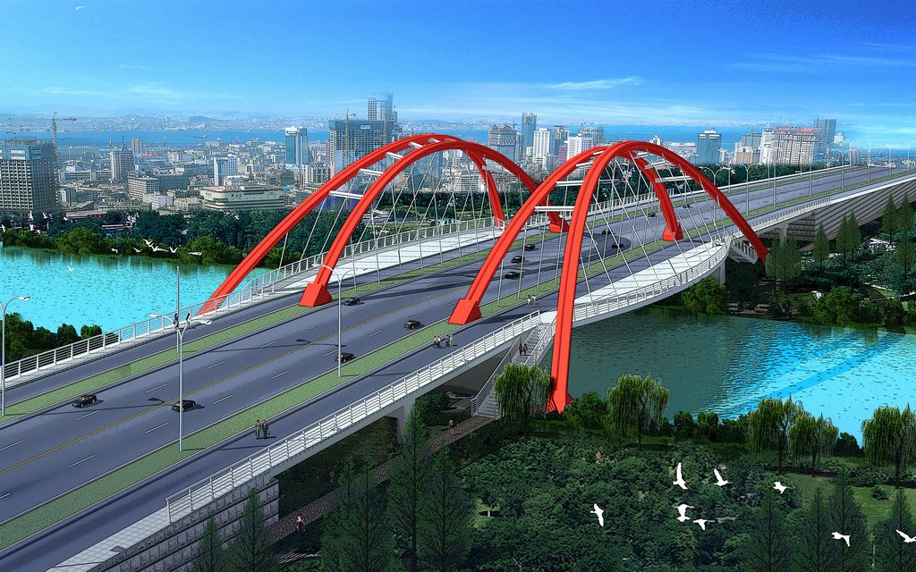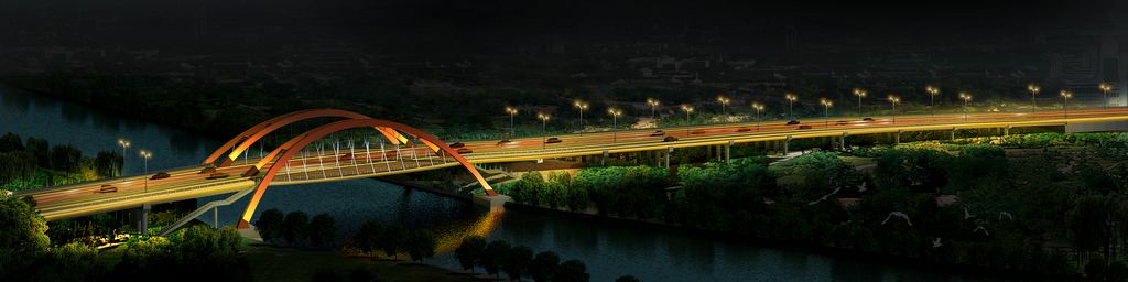 儀揚河大橋位于儀揚河南堤與南輔道連接線段,工程向北跨越儀揚河。儀揚河為人工開挖的運河,往西南約3km與長江主航道相接,規(guī)劃為V級航道,通航凈空為45×5.0m。水位隨潮汐而上下波動,常水位為4.8m左右,相應(yīng)的水面寬度為60m。 本橋橋位處儀揚河河道中心線與橋梁軸線的呈80°斜交。為保證通航凈空和減小橋梁對儀揚河行洪的影響,本橋方案設(shè)計時考慮為一跨過河的方案。根據(jù)現(xiàn)場踏勘和相應(yīng)的測量成果,我院分別提供了不同的橋型方案布置,并做了方案比選,最終橋跨布置為2×25m空心板+60m預(yù)應(yīng)力砼提籃式系梁拱+30+4×25m空心板梁,橋梁總長為246.79m。
